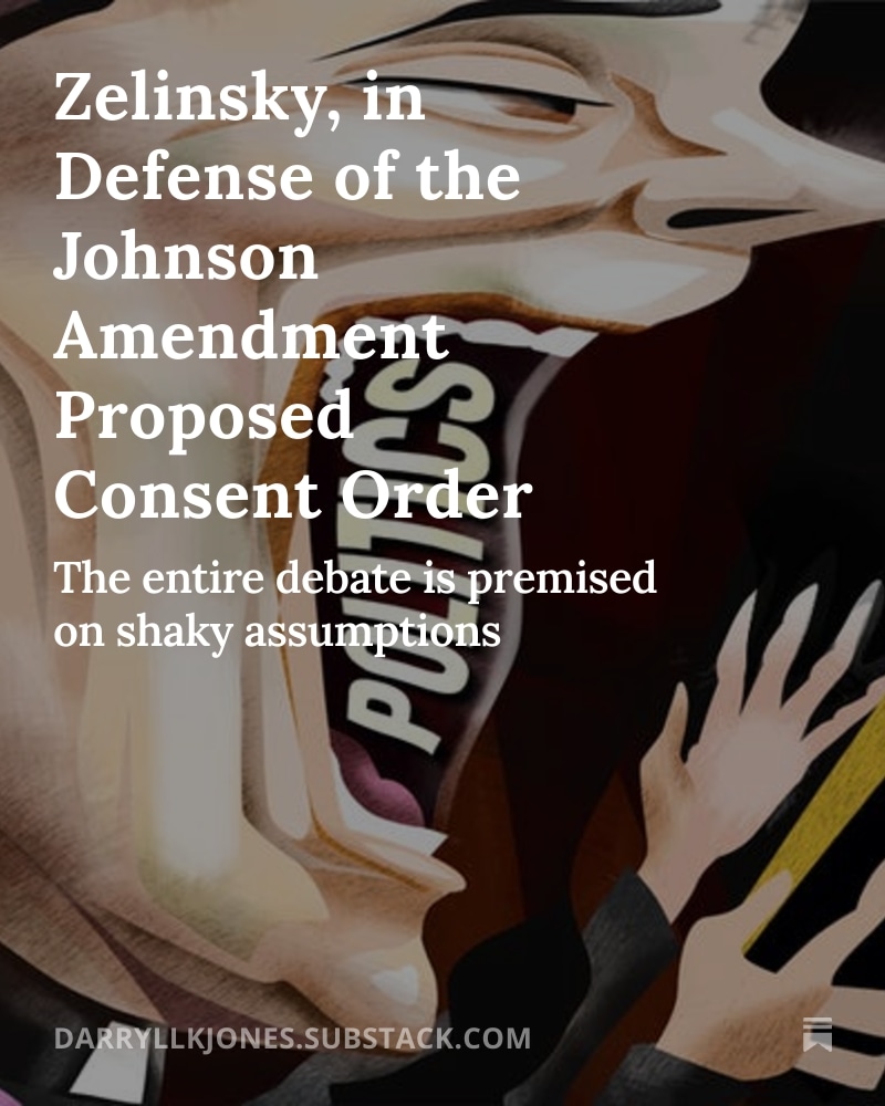 Zelinsky, In Defense of the Proposed Johnson Amendment Consent Order Share Share LinkedIn X Facebook Permalink By nonprofitlawprof August 15, 2025 Today for all readers on Jonesing for Nonprofits: